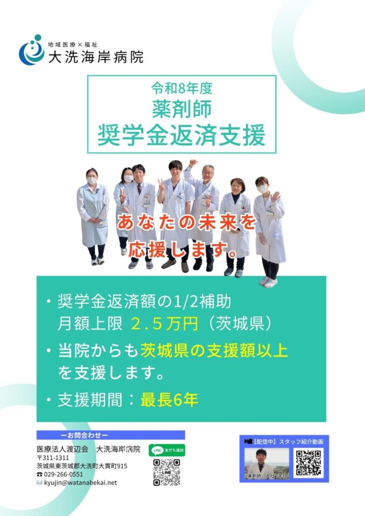 下記の通り薬剤師を目指す学生様・現薬剤師の皆様の奨学金返済に大洗海岸病院は支援させていただきます。